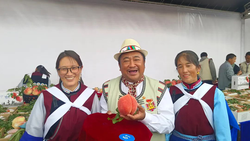 麗江雪桃產(chǎn)業(yè)協(xié)會會長楊四龍與“桃后“種植戶和優(yōu)國(右)的合影