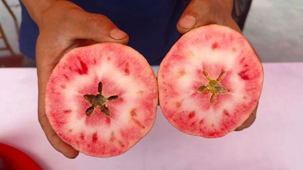 活動現(xiàn)場,不僅有雪桃鮮果,還有雪桃干、雪桃酒等衍生產(chǎn)品。除了明星產(chǎn)品麗江雪桃,我們還看到了很多新品種的水果,比如從瑞士引進、切開后呈紅色的紅心蘋果紅色之愛,只有車厘子大小、口感脆甜的日本乙女蘋果,以及汁水豐富的紅皮梨,都以新鮮的口感豐富了人們的味蕾。